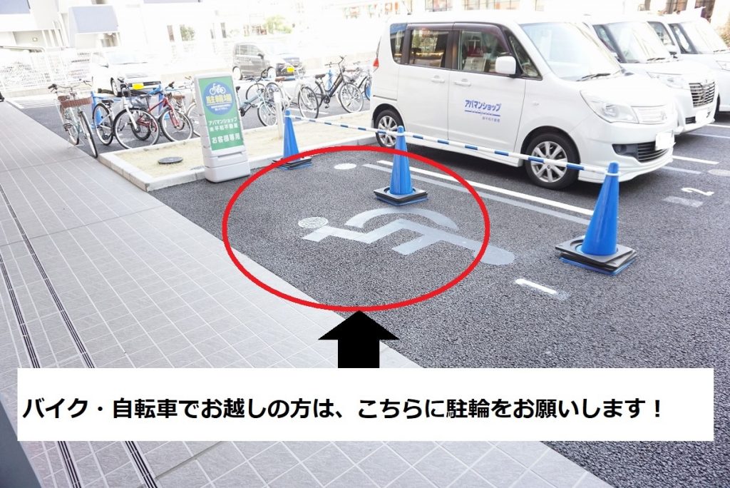 バイク・自転車を駐輪する際は、弊社お客様用駐車場の横に駐輪スペースがございますので、駐輪スペースに駐輪頂くようお願い致します。