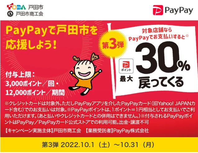 戸田市内対象の店舗でpaypayを使って支払いをすると、30%もポイントが戻ってきます!
