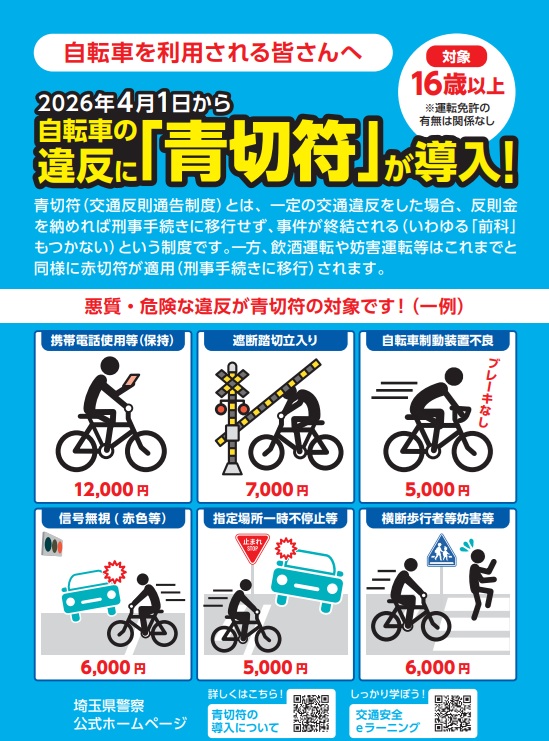 2026年(令和8年)4月1日から自転車への青切符が導入され、自転車の青切符制度は、16歳以上の自転車利用者が対象となりますとのこと